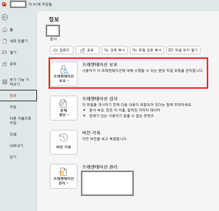 - 프레젠테이션 보호(Protect Presentation) 클릭