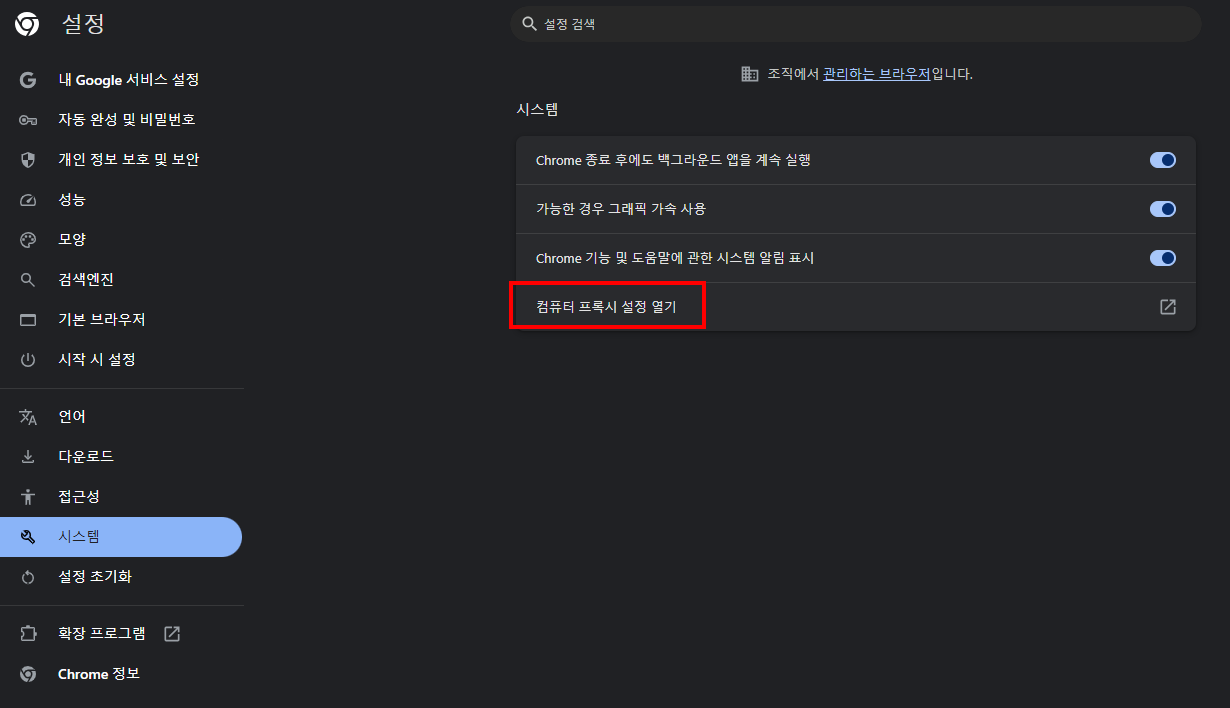 ✔ 크롬: 설정 → 고급 → 시스템 → 프록시 설정 열기에서 프록시 사용 해제