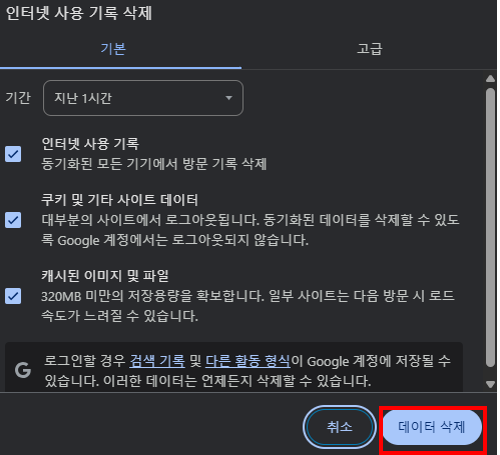 1️⃣ 크롬에서 Ctrl + Shift + Del을 눌러 인터넷 사용 기록 삭제 창 열기